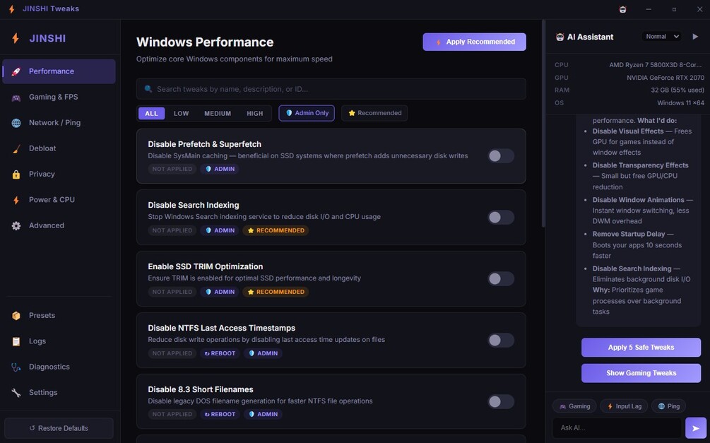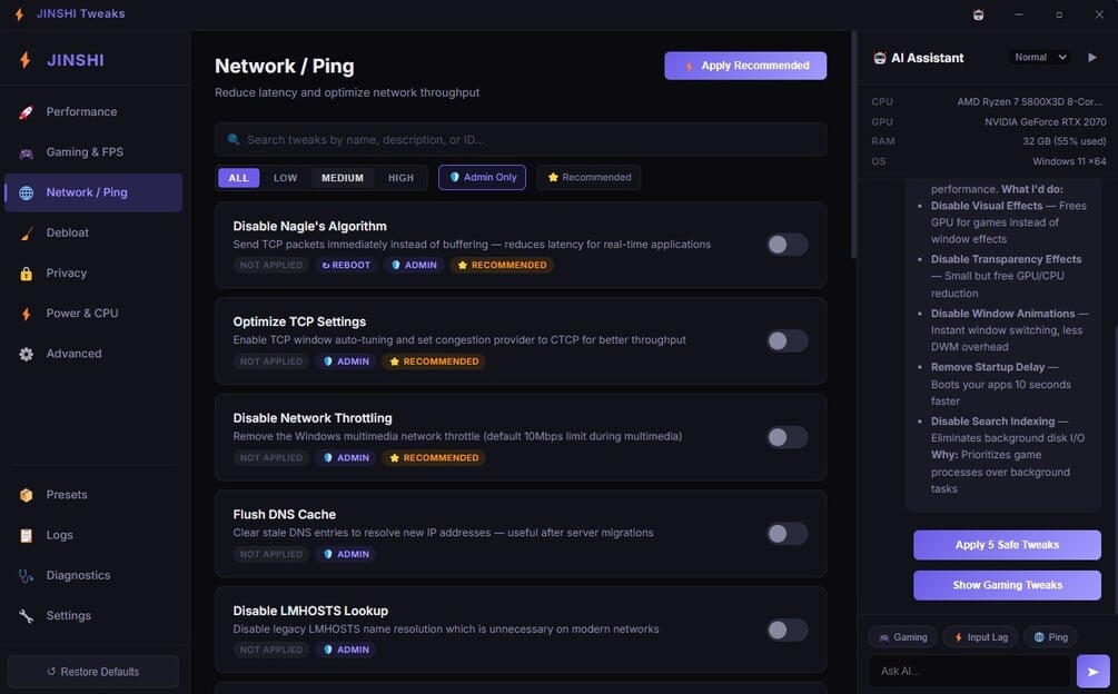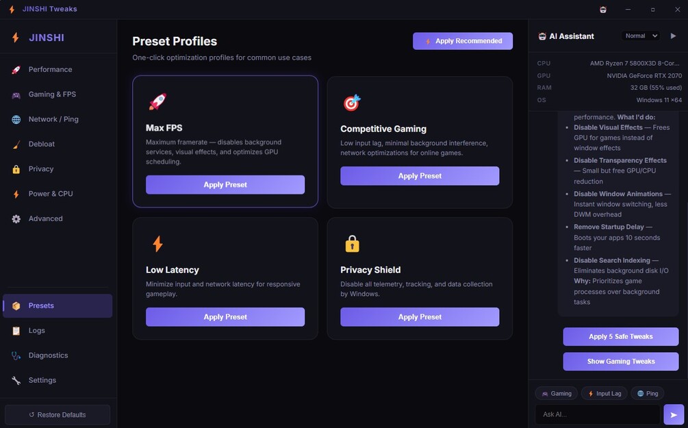 130+ safe, reversible Windows tweaks Performance, gaming, network, and privacy optimizations One-click apply and restore No telemetry or background services
